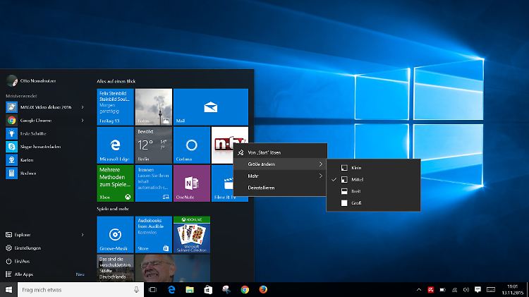 - Bei den Kacheln im Startmenü wird nach dem Update ein verbessertes Kontextmenü angezeigt. Die Symbole für die Größenänderungen sehen jetzt viel eleganter aus und es gibt den Punkt "Mehr", wo Nutzer unter anderem direkt App-Bewertungen im Store schreiben können.