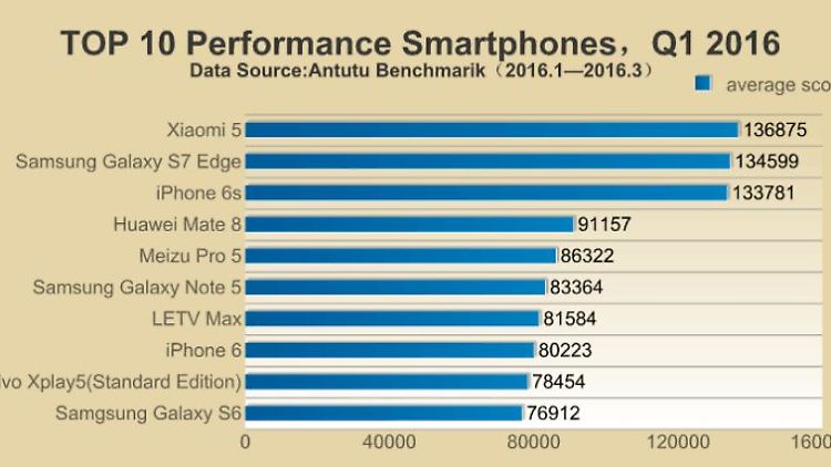 Unter den Erstplatzierten finden sich die aktuellen Leistungsträger von Samsung, Apple und Xiaomi. Die Führungsposition nimmt das Xiaomi Mi5 ein, mit 136.875 Punkten steht es knapp vorm Galaxy S7 Edge von Samsung, das es auf 134.599 Punkte bringt. Apples iPhone 6s belegt mit 133.781 Punkten den dritten Platz. Auffällig ist der große Abstand des Spitzentrios zu den folgenden Rängen: Huaweis Mate 8 belegt Rang 4, bringt es aber nur auf 91.157 Punkte, also rund 40.000 Zähler weniger als das iPhone 6s.