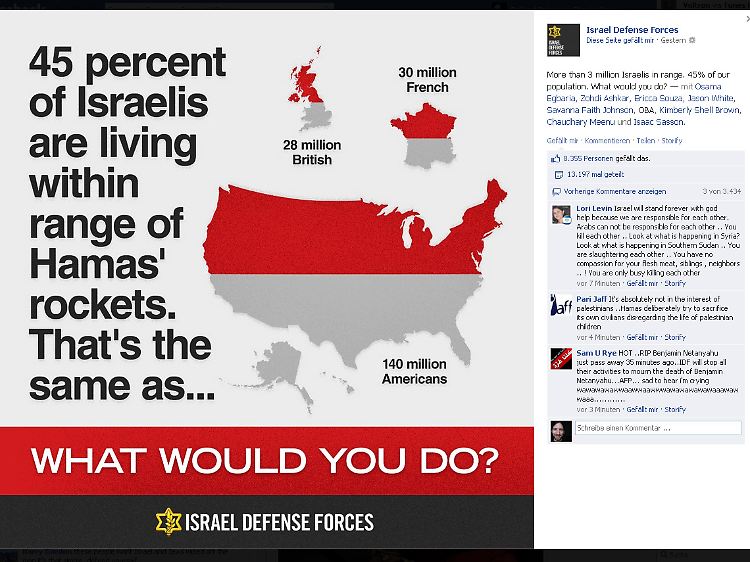 Während zwischen dem Gazastreifen und Israel die Raketen sprechen, läuft im Netz die Propagandamaschine gegen den jeweiligen Feind. Besonders die israelische Armee vollführt eine digitale PR-Offensive. Es ist schwer, den Meldungen der IDF zu entkommen. Auf Facebook betont die Armee ihre chirurgisch exakten Angriffe."Wir tun alles, um Schaden an Privatbesitz zu verhindern, während die Hamas ihre Zivilisten als menschliche Schilde benutzt", so eine Meldung. Grafiken rechtfertigen die Operation "Säule der Verteidigung" im Gazastreifen mit Zahlen und stellen dem internationalen Publikum die Frage: "Was würdest Du tun?"