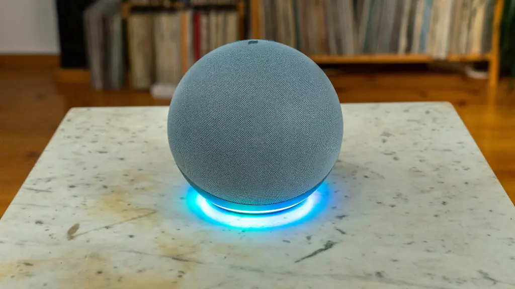 Natürlich hat auch der vierte Echo den Sprachassistenten Alexa an Bord. Sechs Mikrofone sorgen dafür, dass der Lautsprecher selbst bei lauterer Musik Sprachbefehle noch gut versteht, ohne dass man ihn anschreien muss. Man kann das Gerät aber auch über die Tasten an der Oberseite steuern und mit dem zentralen Knopf Alexa taub stellen. Er leuchtet dann ebenso wie der Ring im Gehäuseboden rot, der ansonsten bei Befehlen blaugrün reagiert.