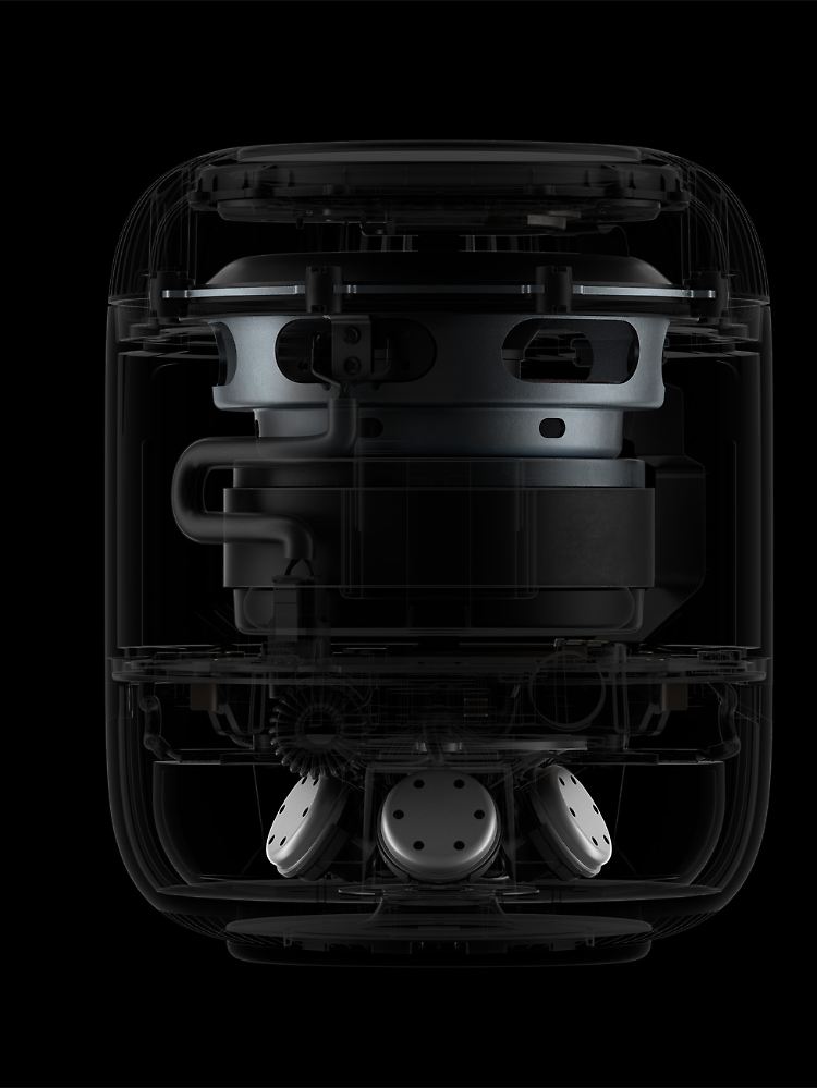 Das Innenleben hat Apple runderneuert. Neben einem nach oben gerichteten 4-Zoll-Mittel-Tieftöner hat der Lautsprecher unten jetzt fünf statt sieben Hochtöner, die mit fast 45 Grad viel stärker nach oben zeigen als beim Vorgänger. Siri hört jetzt mit vier statt sechs Mikrofonen zu und das Herz des HomePod ist jetzt ein S7-Chip, der auch in der Apple Watch 7 zum Einsatz kommt. Neu sind außerdem Sensoren, die Lufttemperatur und Feuchtigkeit messen.