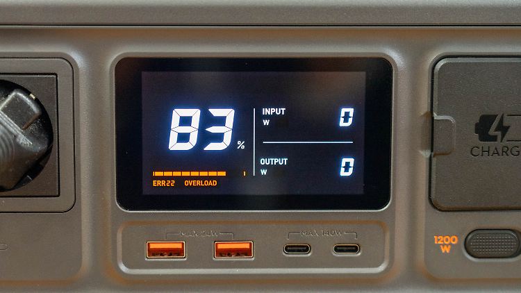 So gibt das Unternehmen die Ladezeit der Powerstation bei maximal 1200 Watt mit rund 70 Minuten an. Im Test war die Batterie nach 68 Minuten voll geladen. Laut Strommessgerät zog sie dafür genau 1 kWh, arbeitet hier also praktisch verlustfrei.