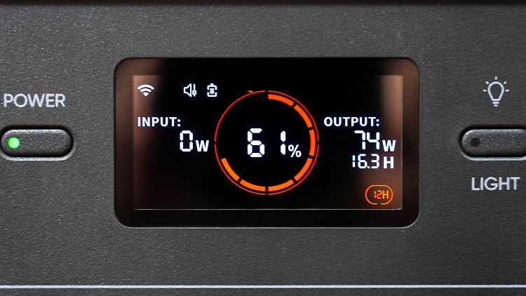 Zentral unter dem Firmenlogo sitzt ein LCD, das die relevantesten Informationen wie In- und Output, verbleibende Kapazität und geschätzte Dauer bis zur kompletten Ent- oder Aufladung anzeigt. Ebenso sieht man auf dem Bildschirm Warnungen bei zu hohen oder zu niedrigen Temperaturen sowie Fehlermeldungen. Rechts neben dem Display gibt es noch ein praktisches Campinglicht, das in zwei verschiedenen Helligkeitsstufen leuchten oder im Notfall blinken kann.