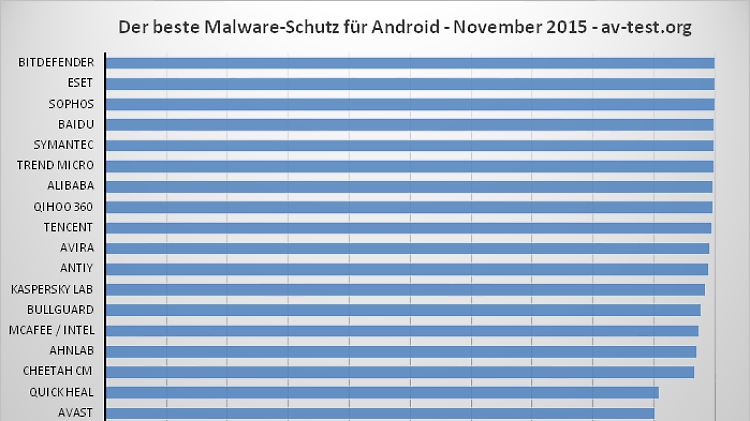 Das Ergebnis des Tests kann Android-Nutzer aufatmen lassen: Drei Apps erreichten 100 Prozent, nur eine blieb unter 96 Prozent und damit deutlich abgeschlagen vom Rest des Testfelds. Das Bestergebnis teilen sich die Antivirus-Apps von Bitdefender, Eset und Sophos. Dicht dahinter liegen die Lösungen von Baidu (99,99 Prozent), Symantec und Trend Micro (beide 99,98 Prozent). Nur sieben Apps erreichen weniger als 99 Prozent, Avast liegt mit exakt 99,01 Prozent auf Platz 18. Den letzten Platz belegt die App von AVG mit einem deutlich schlechteren Ergebnis als die Mitbewerber (91,59 Prozent).
