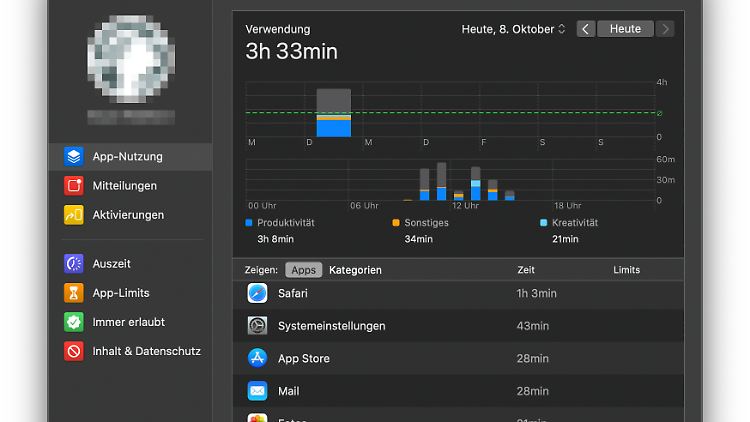 - Wie man es von iPhone und iPad schon kennt, hat man jetzt auch auf dem Mac seine Bildschirmzeit immer im Blick. Wer möchte, plant Zeiten, in denen der Mac aus bleibt oder legt Limits für Apps oder Websites fest. Eltern haben die Möglichkeit, die Bildschirmzeit für ihre Kinder zu regeln.