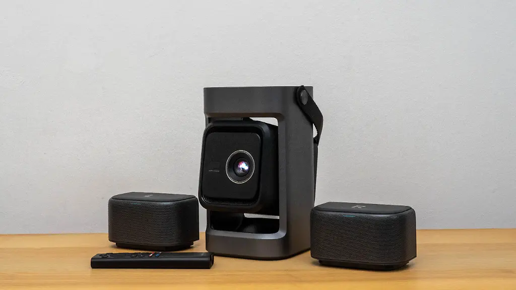 Der Nebula P1 ist insgesamt eine pfiffige, äußerst kompakte Lösung. Der Beamer misst lediglich 22,6 x 20,3 x 18,4 Zentimeter und wiegt gerade mal 3,3 Kilo. Die Oberseite bilden zwei kleine, sechs Zentimeter hohe Bluetooth-Boxen, die dort angedockt über Pins aufgeladen werden. Um die magnetisch aneinander haftenden Lautsprecher abzunehmen, löst man ihre Verankerung über einen Schieberegler auf der Rückseite des Projektors. Danach kann man sie beliebig platzieren.
