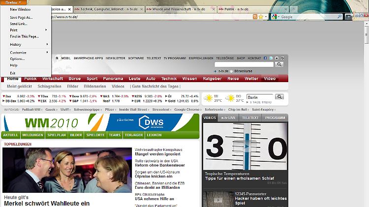 Die zwei wichtigsten Neuerungen der Oberfläche fallen gleich nach dem ersten Start ins Auge: Die Menüleiste ist futsch, stattdessen befindet sich jetzt links oben der "Firefox-Knopf", der alle wichtigen Funktionen in einem einzigen Aufklapp-Menü öffnet. Das wirkt aufgeräumt und man gewöhnt sich recht schnell an die neue Menüführung.