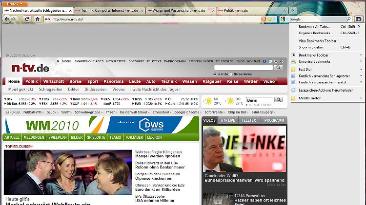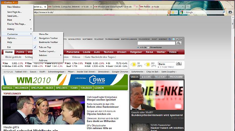 Wer den Knopf nicht mag, kann über ihn jederzeit die Menüleiste wieder einblenden und wie gewohnt navigieren. Das gilt auch für die Tabs, die in Firefox 4 jetzt standardmäßig über der Adressleiste sitzen. Weiter oben ist nur noch der Firefox-Knopf. Wenn man das Häkchen vor "Tabs on Top" entfernt, rutschen die Tabs wieder nach unten.