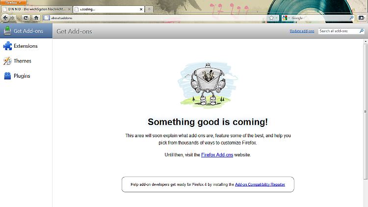 Der Add-on-Manager sieht zwar schon anders aus, bietet aber bisher nur die bekannten Funktionen. Bei einem Klick auf "Get Add-ons" öffnet sich immerhin ein Fenster, das verspricht, dass bald "etwas Gutes kommt".