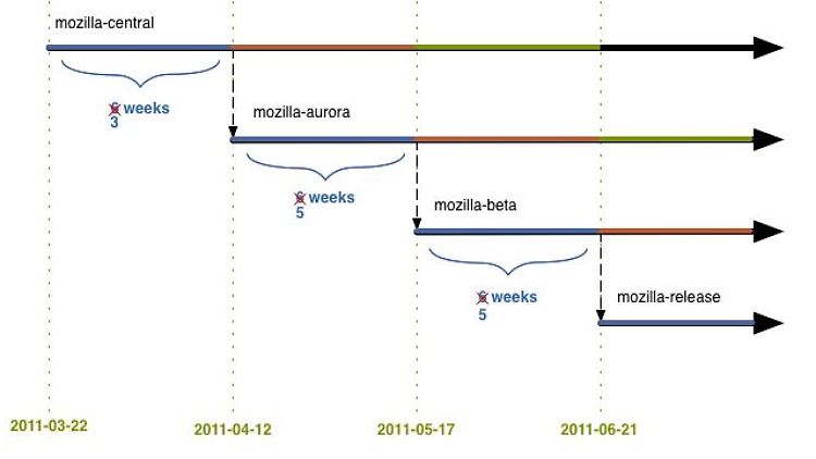 Nach dem ehrgeizigen Fahrplan startet die Arbeit an einem neuen Firefox bereits, wenn eine Version die Startphase (Mozilla-Central) nach drei Wochen verlässt und in die sogenannte Aurora-Phase wechselt, auf die nach fünf Wochen die erste Beta folgt. Kann Mozilla den rasanten Rhythmus durchhalten, steht schon am 16. August der finale Firefox 6 zum Download bereit.