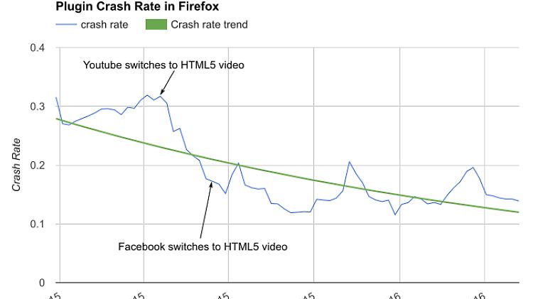Dir Grafik zeigt, dass mit der Umstellung von Flash auf HTML die Stabilität von Firefox zunimmt.