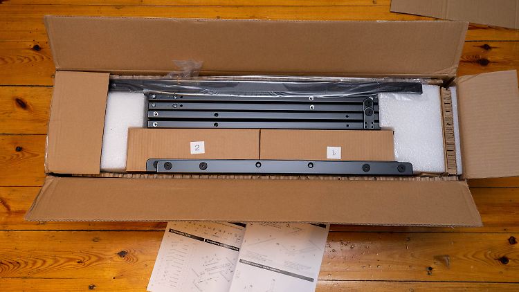 Das Metallgestell alleine wiegt rund 30 Kilo und kommt in einem mit 95 × 25 × 21,5 Zentimetern ziemlich kompakten Karton. Trotzdem fällt recht viel Verpackungsmüll an, der neben verschiedenen Kartonagen auch aus einigen Lagen Schaumstoff und Schutzfolien besteht.
