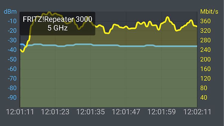 Die gemessenen Geschwindigkeiten waren dabei beachtlich. Im Verbund mit der Fritzbox Cable betrugen die Übertragungsraten durchschnittlich etwa 315 Megabit pro Sekunde (Mbit/s), der Test mit der Fritzbox 7580 ergab durchschnittlich knapp 345 Mbit/s. Die 5-Gigahertz-Verbindung zwischen WLAN-Geräten und Repeater blieb im Umkreis von 20 Metern stabil. Bei einem Wechsel ins 2,4-Gigahertzband sank die Datenrate auf Werte um 120 Mbit/s. Auch damit kann man zufrieden sein, denn die Verbindung ist stabil. Für 4K-Streaming von Videodiensten benötigt man beispielsweise kaum 20 Mbit/s.
