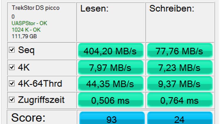 Die Trekstor picco SSD 3.0 kostet in der 128-Gigabyte-Ausführung online rund 90 Euro. Das etwa kreditkartengroße Gerät kommt mit einer stabilen Kunstleder-Tasche mit weiteren Fächern für Kredit- und Visitenkarten. Das Plastikgehäuse der SSD wirkt sehr robust, die gummierte und geriffelte Oberfläche schützt vor dem Abrutschen. Die Trekstor picco liest Daten mit rund 405 Megabyte pro Sekunde (MB/s) recht schnell, liegt aber mit etwa 78 MB/s beim Lesen deutlich unter vom Hersteller mit 280 MB/s angegebenen maximalen Datentransferrate. Im Gesamtergebnis erreichte die Trekstor im besten Durchlauf 151 Punkte.