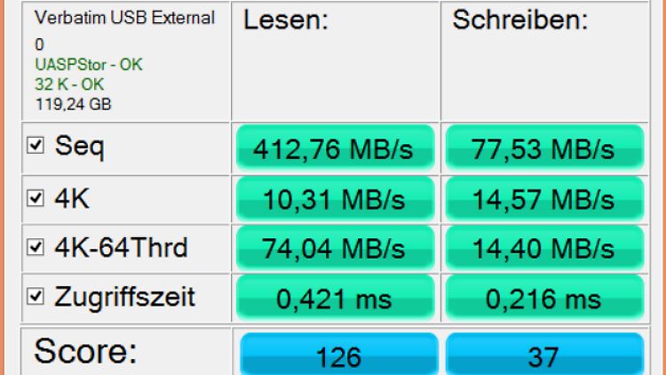 Verbatim hat seine externe SSD mit 256 Gigabyte in den Test geschickt. Sie ist ab etwa 140 Euro zu haben, die 128-Gigabyte-Version kostet knapp 80 Euro. Die Verbatim-SSD hat ebenfalls ein stabiles Kunststoffgehäuse, für Transport und Aufbewahrung kommt sie in einen samtigen Stoffbeutel. Ihre Schreibleistungen sind mit denen der Trekstor picco fast identisch, die Verbatim-SSD war aber in den anderen Bereichen etwas schneller und absolvierte den Benchmark-Test mit insgesamt 214 Punkten.