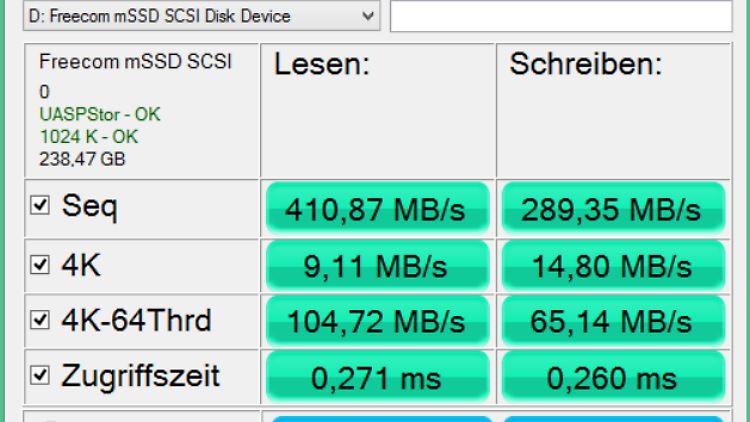 Der eleganter Bruder des ToughDrive ist die in einem feuerzeuggroßen Aluminiumgehäuse steckende Freecom MSSD. Sie ist online ab 205 Euro zu haben und erreichte im AS-SSD-Test stolze 400 Punkte. Laut Benchmark-Tool ist die Freecom-SSD tatsächlich ein Toshiba-Flashspeicher.