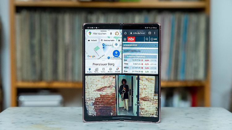 Der große Innen-Bildschirm lässt sich bei der zweiten Generation des Fold noch besser nutzen. So kann man jetzt drei App-Fenster in verschiedenen Layouts darauf verteilen und Inhalte lassen sich per Drag-and-drop zwischen den Anwendungen teilen. Das klappt mit Samsung-Apps, aber auch mit angepassten Anwendungen von Drittanbietern.