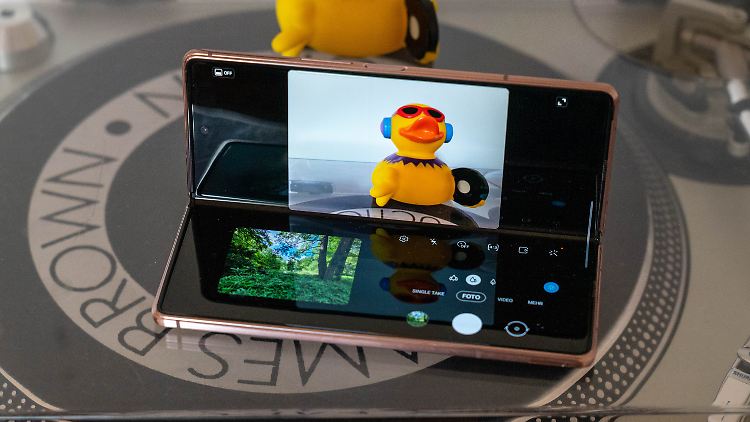 Samsung reizt die Möglichkeiten des Galaxy Z Fold 2 auch bei der Kamera-App aus. So sieht man in der oberen Hälfte das Motiv, während unten eine Galerie der zuletzt gemachten Aufnahmen, Einstellungen und Auslöser zur Verfügung stehen. Clever setzt Samsung hier auch das Wechselspiel zwischen Außen- und Innen-Display um. So kann man das Gerät aufklappen, um für ein Selfie die Hauptkamera zu nutzen. Die Vorschau sieht man auf dem Innen-Display, das man auch nutzen kann, um fotografierten Personen die Möglichkeit zu geben, sich selbst in Position zu setzen.