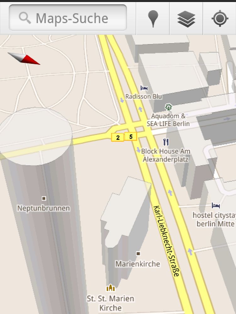 Am auffälligsten sind die 3D-Darstellungen von Gebäuden, die es derzeit für weltweit etwa 100 Großstädte gibt. Unter anderem steht die Funktion für Berlin, Hamburg und München zur Verfügung. Allerdings muss auf dem Telefon mindestens Android 2.0 installiert sein. Befindet man sich in einer Stadt mit 3D-Ansicht, wird das "Mein Standort"-Symbol nach einem Tipper zu einer Kompassrose. Tippt man sie erneut an, richtet sich der Standort-Pfeil in Blickrichtung aus und die Karte folgt Drehungen.