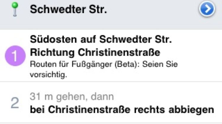 Auch Google will sich vor Schadensersatz- oder Schmerzensgeldklagen schützen und weist in Maps ausdrücklich darauf hin, dass sich der Dienst noch in der Betaphase befindet und deshalb möglicherweise keine fehlenden Fußwege anzeigt.