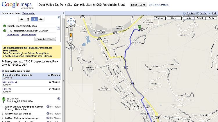 31.05.2010, 12:08 UhrIn den USA musste eine Frau für ihr blindes Vertrauen in Googles Kartendienst Maps schmerzhaft bezahlen. Sie ließ sich für einen Spaziergang in Park City (US-Bundesstaat Utah) von Maps eine Route berechnen und auf ihrem Blackberry anzeigen. Der Dienst, der sich im Fußgänger-Modus noch in der Betaphase befindet, machte allerdings einen Fehler: Der Weg der Frau führte eine halbe Meile entlang einer vierspurigen Straße. An dem Highway gibt es allerdings keine Fußwege. Trotzdem folgte die Frau der Route und wurde prompt von einem Auto erfasst und schwer verletzt.