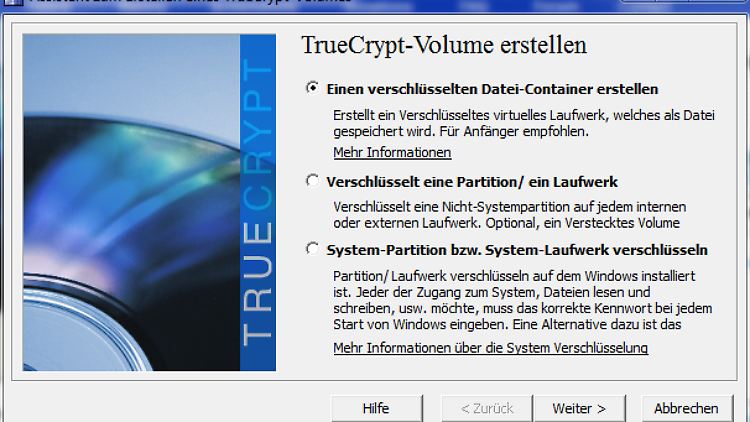 Beim ersten Start des Programms öffnet sich ein Fenster, in dem Sie auf "Volume erstellen" klicken. Danach können Sie festlegen, ob Sie einen Tresor für Dateien anlegen oder eine Partition oder Festplatte verschlüsseln möchten. Mit der dritten Option sichern Sie das komplette System ab. Für den Normal-Nutzer ist "Einen verschlüsselten Datei-Container erstellen" die erste Wahl. Klicken Sie auf "Weiter".