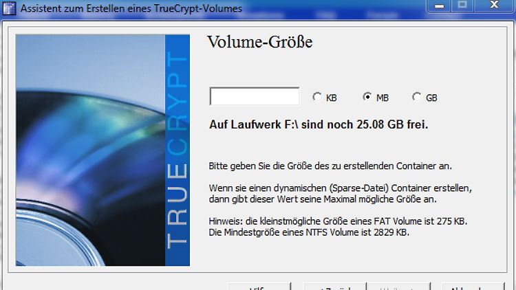 Danach legen Sie die Größe des Volumes fest. Für Dokumente sind ein paar Megabyte (MB) völlig ausreichend, für Bilder Musik- oder Videodateien sollten es schon einige Gigabyte sein.