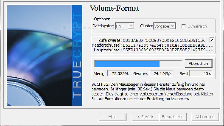 Ohne Schlüsseldatei geht's weiter zum "Volume-Format". Hier ist etwas Handarbeit angesagt. Denn um die Verschlüsselung möglichst zufällig zu machen, müssen Nutzer den Mauszeiger über das Fenster wirbeln. Im Anschluss klicken Sie auf "Formatieren" und nach ein paar Sekunden ist Ihr Datentresor fertig. Klicken Sie auf "Beenden".