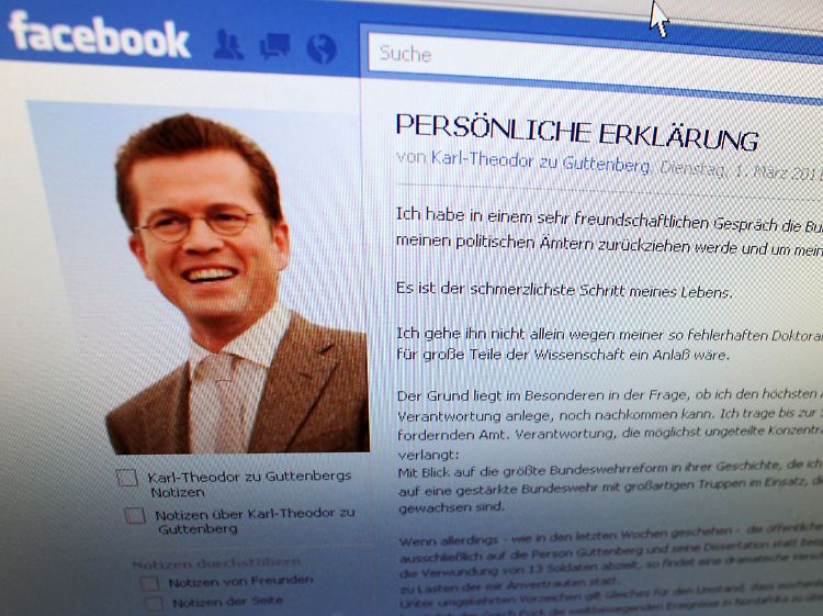 Schon auf dem Höhepunkt der Plagiatsvorwürfe gegen den damals noch nicht zurückgetretenen Verteidigungsminister vor einer Woche hatten sich seine Fans bei Facebook gruppiert. Die Gruppe "Gegen die Jagd auf Karl-Theodor zu Guttenberg" kam trotz des etwas sperrigen Namens innerhalb weniger Tage auf 336.600 Mitglieder. Sie war vor knapp zwei Wochen ins Leben gerufen worden.