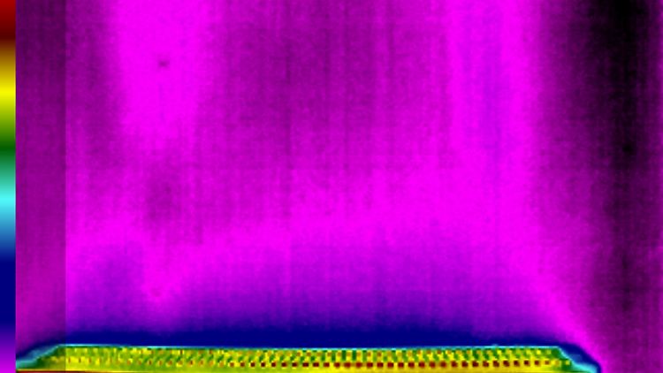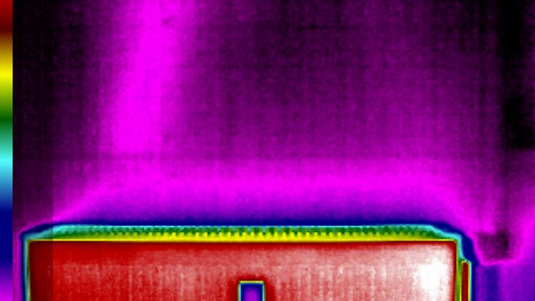 Um die Wirkung der Heizkörperventilatoren sichtbar zu machen, hat sich ntv.de die Aufsteck-Wärmebildkamera Seek Thermal ComactPro ausgeliehen. An den Aufnahmen sieht man gut, dass die warme Luft rascher und gleichmäßiger aufsteigt, nachdem die Lüfter aktiviert wurden.