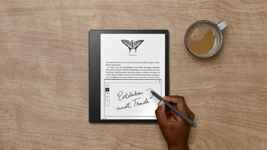 Der Eingabestift haftet magnetisch an der Seite des E-Book-Readers und benötigt selbst keinen Strom. So soll der Kindle Scribe trotz der neuen Funktion sparsam sein. Eine Aufladung soll für "mehrere Monate Lesegenuss und mehrere Wochen Schreibvergnügen" ausreichen. Der Stift bietet mehrere Strichstärken, einen Textmarker, Radierer und ein Rückgängig-Werkzeug.