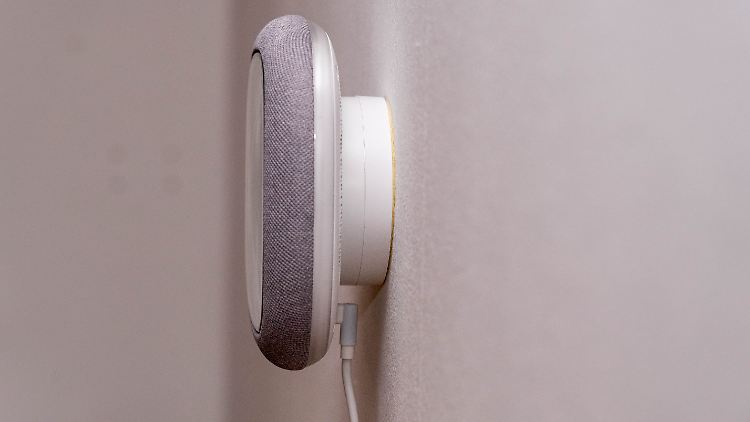 Zunächst unterscheidet sich das rund 16 x 16 x 3,5 Zentimeter große Gerät schon durch sein ansprechendes Äußeres von den meisten Smart-Home-Konkurrenten. Es hat eine spiegelnde Oberfläche, die von einem grauen Stoffbezug umrandet ist und könnte auch eine attraktive Wand- oder Deckenleuchte im 70er-Jahre-Look sein.