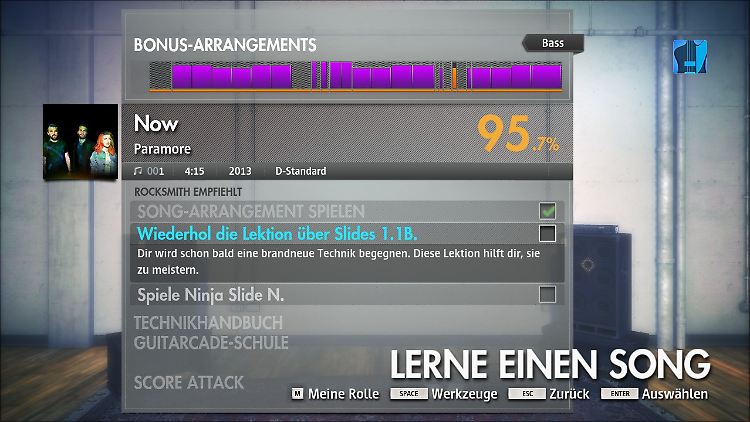 Wer jetzt das Programm öffnet, wird nicht lange mit irgendwelchem Vorgeplänkel aufgehalten. Es gilt lediglich die Frage zu beantworten, in welchem Level man starten möchte und ob man das Lernprogramm in Richtung Lead-, Rhythmus-Gitarrist oder als Bassist eröffnen möchte. Bei Letztgenanntem sollte man selbstredend den vierseitigen Langhals zur Hand haben. Der Autor entschied sich, seiner musikalischen Biografie folgend, für den Rhythmus-Part. Diese Entscheidung sollte sich auch als richtig erweisen, denn das Programm lässt nichts anbrennen und fordert sofort auf: "Lerne einen Song". Und die Track-Liste liest sich gut: Def Leppard "Pour Some Sugar On Me", Pantera "Cemetery Gates", Ramones "Blitzkrieg Bop", R.E.M. "Losing My Religion", System Of A Down "Hypnotize" oder White Zombie "Thunder Kiss '65". Insgesamt stehen über 50 Titel zur Verfügung, die durch Ubisoft sukzessive erweitert werden.