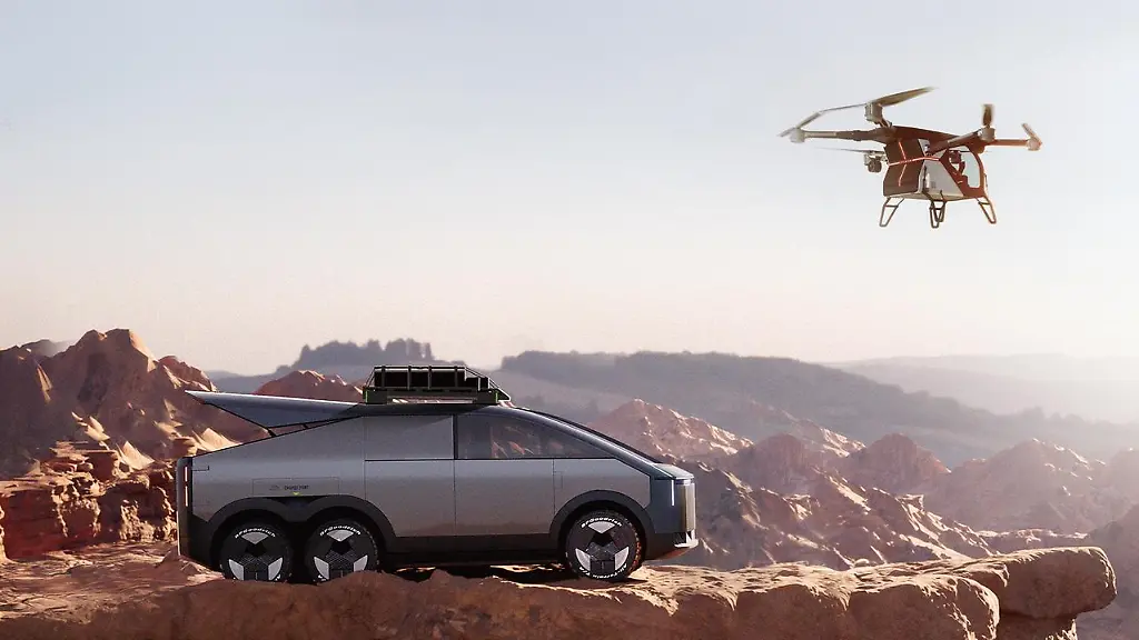 Modular bedeutet hier, dass ein futuristisches aussehendes Fahrzeug mit drei Achsen einen Flug-Copter in seinem "Kofferraum" hat, der im Prinzip ein Flugtaxi ist. Das Straßenmodul bleibt zurück, während seine Passagiere mit dem Flugmodul abheben.