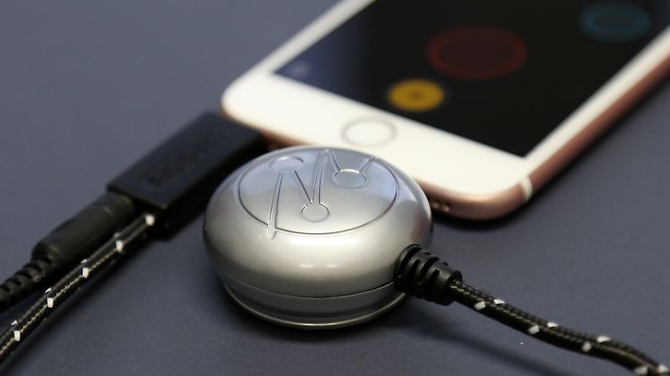 Inzwischen ist Mogees bei den Unterstützern angekommen, weitere Geräte werden über die eigene Homepage vertrieben. Spektakulär sieht es nicht aus, ein kleines silberfarbenes Gehäuse von der Größe eines plattgedrückten Tischtennisballs beherbergt die Vibrationssonde, ein Kabel mit 3,5-mm-Klinkenstecker und Audioausgang stellt die Verbindung zum Smartphone her. Die Klebefläche gibt Mogees auf nahezu jeder Oberfläche sicheren Halt. Die Umwandlung in Musik passiert in der App: Der Sensor nimmt Schwingungen auf und wandelt sie in elektrische Signale um, die App analysiert sie und macht Musik draus.