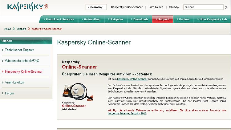 - Wenn Sie Ihren PC mit einem weiteren Online-Scanner prüfen wollen, dann verwenden Sie den Scanner von Kaspersky.