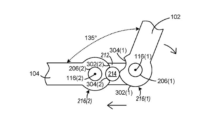 In dem Patent geht es aber speziell um das Gelenk, das die beiden Panels raffiniert verbindet. Beide Displays haben zylinderförmige Halterungen, die elastisch gehalten an einer Achse abrollen und jeweils eine Nut haben, die sie in einer bestimmten Position arretieren. So sind stabile Positionen zusammengeklappt, aufgeklappt, umgeklappt und bei einem Winkel von 135 Grad möglich.