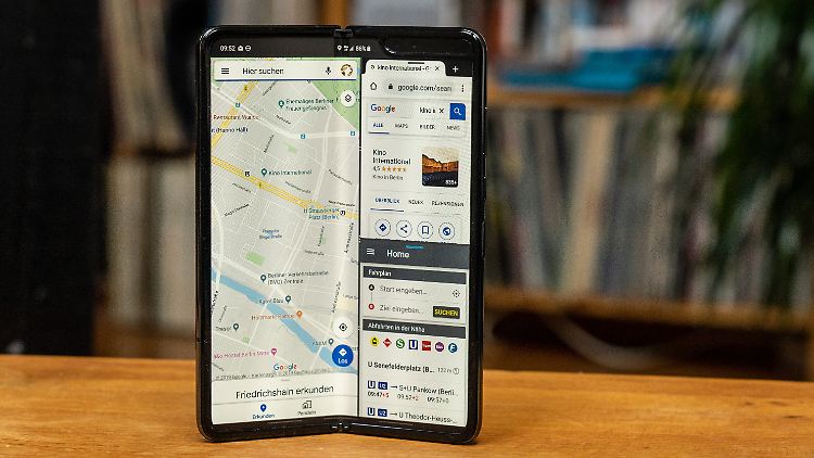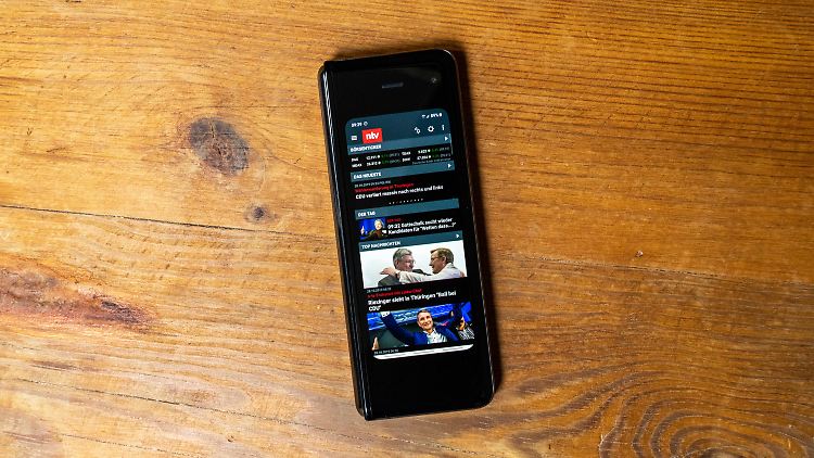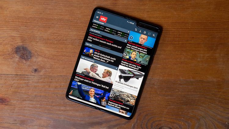 Zusammengeklappt kann man das Galaxy Fold fast wie ein ganz normales Smartphone nutzen, da es auf der Außenseite ein zweites Display hat. Aber der Bildschirm misst nur 4,6 Zoll und ist mit dem Seitenverhältnis 21:9 sehr schmal. Man nutzt ihn daher vor allem, um Benachrichtigungen zu lesen oder einen schnellen Überblick über E-Mails, in sozialen Medien oder über News in der ntv-App zu gewinnen. Möchte man mehr sehen oder machen, klappt man das Galaxy Fold auf, und die auf dem Außen-Display dargestellte App wird im Tablet-Modus fortgesetzt.