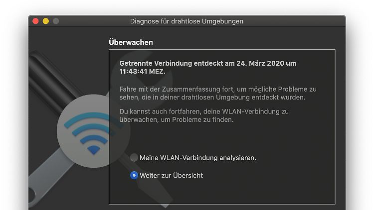 Bei einem Mac-Rechner hält man die Alt-Taste gedrückt und klickt rechts oben auf das WLAN-Symbol. Danach wählt man Diagnose für drahtlose Umgebungen öffnen aus, klickt auf Fortfahren und folgt den Anweisungen. Falls das Problem in diesem Moment nicht besteht, kann man die Verbindung überwachen lassen. Taucht ein Fehler auf, wird man informiert und erhält Empfehlungen, was zu tun ist.