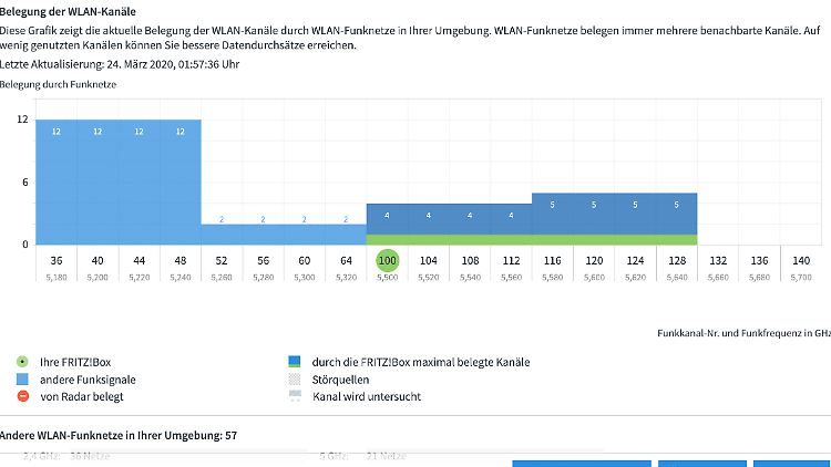 Bei einer Fritzbox findet man die Einstellungen in der Übersicht der Benutzeroberfläche unter WLAN - Funkkanal. Ein Blick auf Belegung der WLAN-Kanäle zeigt, ob die Fritzbox gut gewählt hat. Falls nicht, klickt man oben Funkkanal-Einstellungen anpassen an. Danach kann man nach einem Klick auf Autokanal eine eigene Entscheidung treffen.