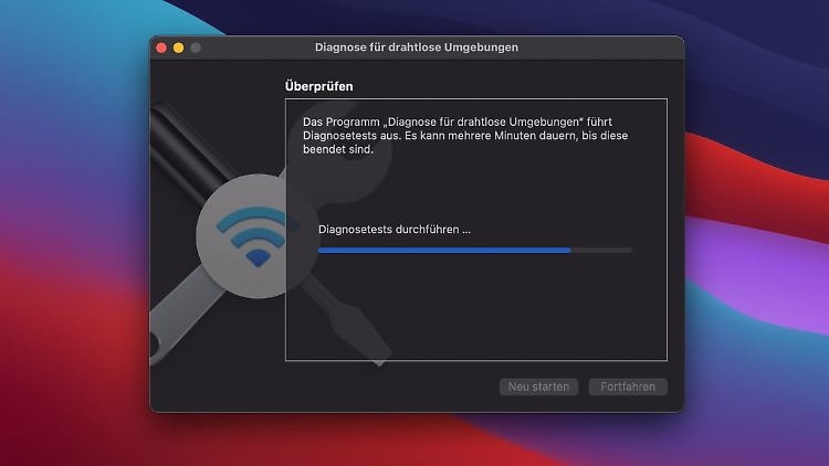 Bei einem Mac-Rechner hält man die Alt-Taste gedrückt und klickt rechts oben auf das WLAN-Symbol. Danach wählt man Diagnose für drahtlose Umgebungen öffnen aus, klickt auf Fortfahren und folgt den Anweisungen. Falls das Problem in diesem Moment nicht besteht, kann man die Verbindung überwachen lassen. Taucht ein Fehler auf, wird man informiert und erhält Empfehlungen, was zu tun ist.