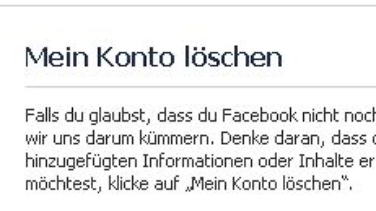"Formular" nennt Facebook das Kästchen, das nun erscheint. Aber keine Angst: Um Facebook zu verlassen, muss man keinen Antrag ausfüllen, sondern nur auf "Mein Konto löschen" drücken. Dann verschwindet das Profil auf Dauer und kann auch nicht später wiederhergestellt werden. Wer es sich nach ein paar Tagen nochmal anders überlegt, bekommt aber nochmal eine Chance, denn die Daten werden nicht sofort vom Server getilgt: Loggt man sich in den nächsten zwei Wochen doch nochmal bei Facebook ein, wird die Löschung widerrufen.