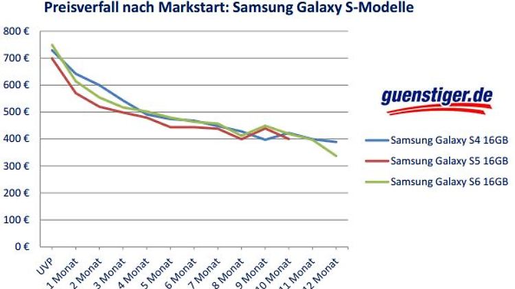 Mit einer unverbindlichen Preisempfehlung (UVP) von knapp 700 Euro siedelte Samsung sein Galaxy S5 in ähnlichen Preisregionen wie das iPhone an. Doch dort konnte es sich nicht lange halten. Wie schon beim S4 gab auch beim S5 einen Monat nach Marktstart der Preis um 18 Prozent nach. Weitere vier Wochen später war es schon mehr als ein Viertel günstiger. Und wer ein halbes Jahr wartete, konnte beim S4 satte 39 Prozent und beim S5 36 Prozent sparen.