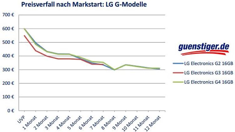Sowohl beim G3 als auch beim Vorgänger, dem G2, sanken die Preise schon in den ersten Wochen um 27 bzw. 28 Prozent. Nach drei Monaten waren es jeweils 31 Prozent. Setzt sich diese Entwicklung auch beim G4 fort, liegt der Preis also schon nach drei Monaten fast ein Drittel unter dem Ausgangsniveau. Momentan ist das LG G3 in der günstigsten Version ab 320 Euro zu haben.