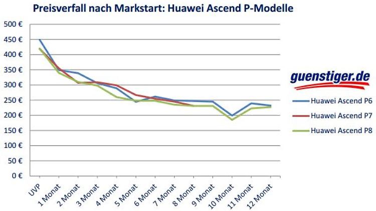 Wer viel Leistung für wenig Geld möchte, liegt mit Huawei richtig. Das Ascend P7 startete mit einer UVP von gerade mal 419 Euro in den Markt - für ein Smartphone mit Highend-Ausstattung ein echter Kampfpreis. Nach zwei Monaten gab es das Gerät dann nochmal um ein Viertel günstiger. Wer sich für den Nachfolger, das P8, interessiert, könnte sich nach zehn Monaten die größte Ersparnis sichern. Das Vor-Vorgängermodell Ascend P6 sank innerhalb dieses Zeitraums jedenfalls um 56 Prozent im Preis. "Ungeduldige sollten wenigstens drei Monate ausharren, um 20 bis 30 Prozent zu sparen", rät Artur Jagiello von guenstiger.de.