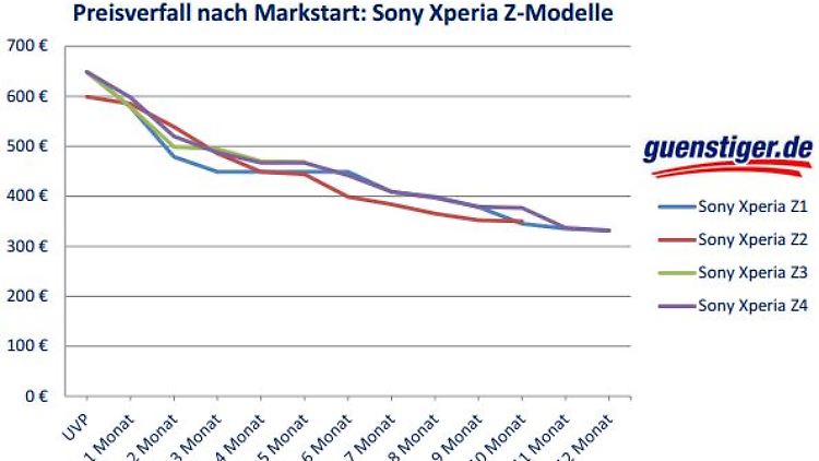 Sony wird sein Z4 erst nach dem MWC präsentieren, eine Pressekonferenz haben die Japaner in Barcelona jedenfalls nicht angesetzt. Wenn das neue Flaggschiff dann kommt, sollte man sich noch drei Monate gedulden. Zumindest bei den Vorgängern purzelten in dieser Zeit die Preise um durchschnittlich 25 Prozent. Dann kann man aber auch ruhigen Gewissens zuschlagen, viel weiter geht es erstmal nicht runter. Nach einem halben Jahr waren das Z1, Z2 und Z3 im Schnitt um knapp ein Drittel billiger. Nach zwölf Monaten konnte man sie schon für die Hälfte bekommen. Beim Z3 ist die Preiskurve inzwischen aber wieder nach oben geschnellt, momentan wird es für 475 Euro gehandelt.