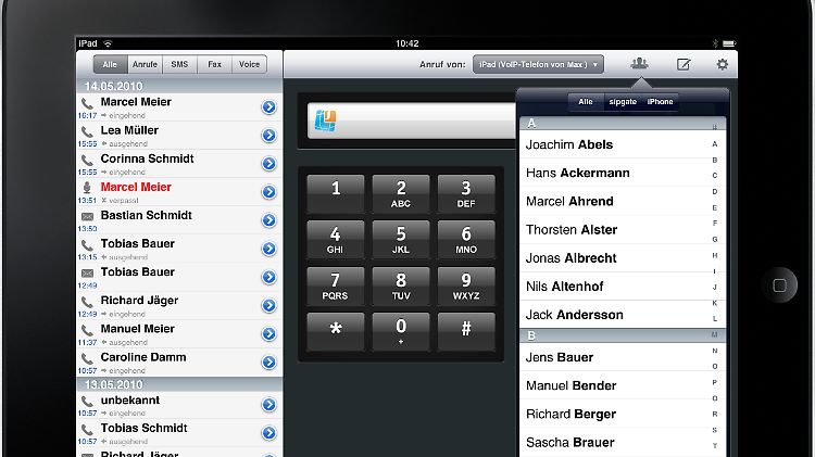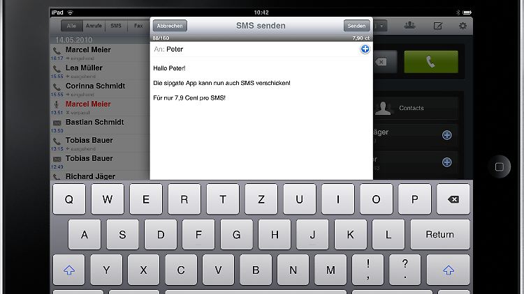 Mit Sipgates VoIP-App können iPad-Nutzer über UMTS oder WLAN telefonieren und SMS-Nachrichten versenden. Dabei steht ihnen in den meisten Fällen auch eine eigene örtliche Rufnummer zur Verfügung. Firmenkunden können mit der App auch Faxe empfangen und sie können einen Anrufbeantworter einschalten.