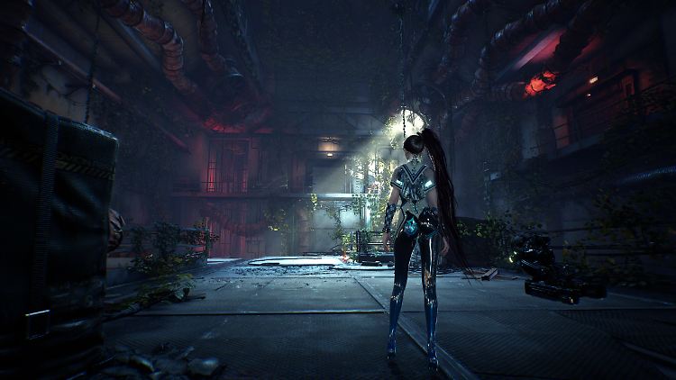 Schade, dabei hat es sich Shift Up leicht gemacht. Das Studio verzichtet auf ein Open-World-Korsett, das Entwickler zwingt, eine vollkommen schlüssige Spielwelt zu schaffen. Doch die teiloffenen Areale sind völlig frei von originellen Designideen, was spätestens beim fünften Mal stressigem Rumsuchens nach einem Schalter, Hebel oder Zugangskarte fürs Weiterkommen klar wird. Alles sieht gleich aus und ist darüber hinaus so öde, dass der Forscherdrang irgendwo in den grauen Staubwüsten versandet. Nie stellt sich die Frage, wie das Leben zuvor ausgesehen haben könnte. Eine Antwort darauf gibt es trotzdem – und hier zeigt sich nicht nur mangelnder Einfallsreichtum, sondern auch eine technophile Ideologie.
