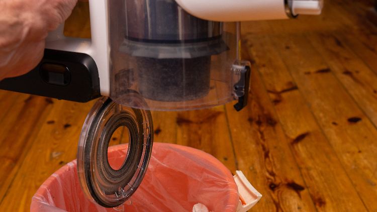 Eine saubere Sache ist auch die Entleerung des Staubbehälters. Man hält ihn einfach über den Mülleimer, drückt einen Hebel nach und die Bodenklappe geht auf. Das muss man gegebenenfalls mehr als einmal pro Putztag machen, da ein halber Liter kein sehr großes Fassungsvermögen ist.
