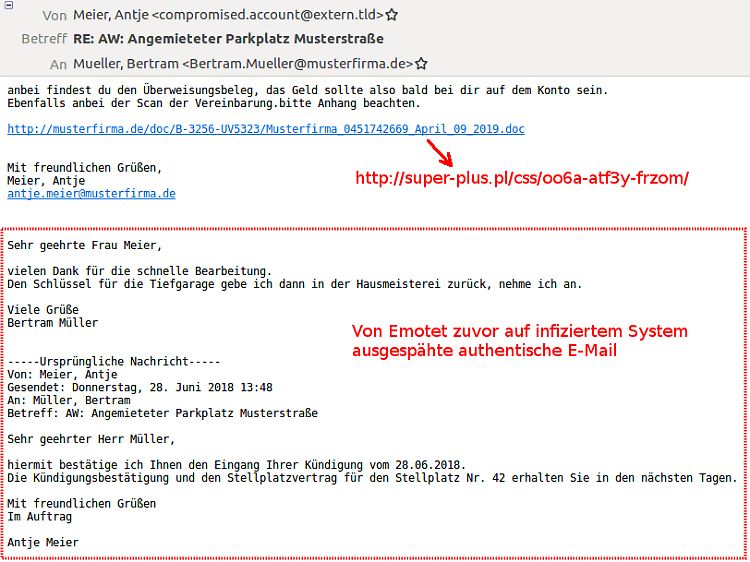 Ein vom CERT auf Twitter verbreitetes Beispiel zeigt, was die neue Tour des Schädlings ist. Jetzt stammen seine Nachrichten nicht mehr nur von echten Kontakten eines Opfers und Anrede, Betreff sowie Signatur stimmen. Emotet bezieht sich jetzt auch ganz konkret auf kürzlich geführte echte E-Mail-Konversationen. Das Opfer hat also den Eindruck, eine erwartete Antwort oder Anfrage erhalten zu haben.